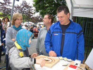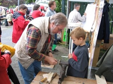 Langenfeld (jste). Jungen und Mädchen hatte das Dreidelfieber gepackt. In Harri’s Dreidelwerkstatt anlässlich des 6. cSc (capp Sport cup) „gemeinsam rollt’s“ in Langenfeld war ständig etwas los. Schleifmaschine, Laubsäge, Feinsäge, Raspel, Feile, Borglehre, Schraubstock, Schleifpapier – alles, was man so braucht, um einen Dreidel oder Kreisel zu basteln, war vorhanden. Und dazu die helfenden Hände von Harri Schlicht, Victor Heinze und ihrer Helfer, die nicht nur zeigten, wie einzelne Teile für den Fadenkreisel hergestellt werden, sondern auch bei schwierigen Arbeiten selbst Hand anlegten.