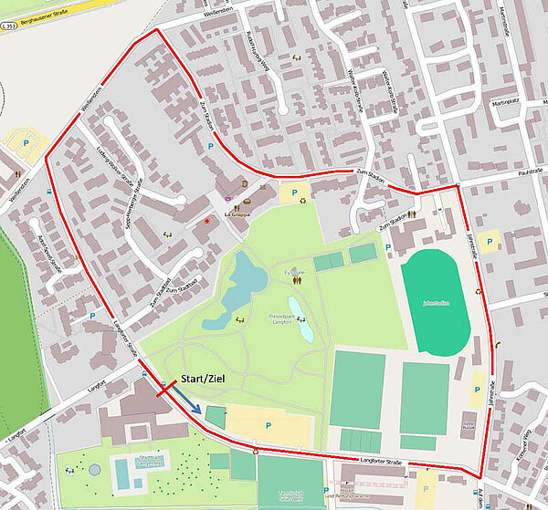 Start (rote Markierung) war auf der Langforter Straße 70 vor dem Bewegungszentrum der SGL. Vorbei an der neuen Feuerwache ging es in einer scharfen Linkskurve in die Jahnstraße. Zum Stadion wurde die Geschwindigkeit immer höher. Achtung - die Linkskurve zum Weißenstein hat es in sich! Die langgezogene Kurve vom Weißenstein in die Langforter Straße hingegen machte keine Probleme. Nach 2.300 Metern war das Ziel erreicht.